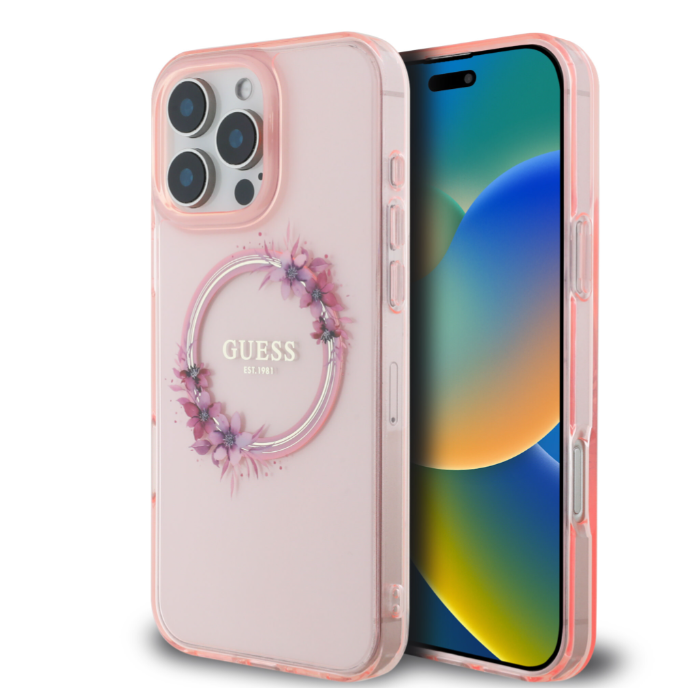 Ümbris Guess GUHMP16LHFWFCP MagSafe Flowers iPhone 16 Pro (roosa)