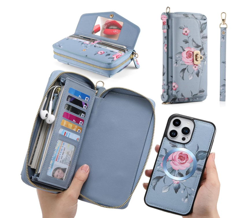 Ümbris-rahakott / MagSafe tagusega iPhone 14 Plus (helesinine roosidega)